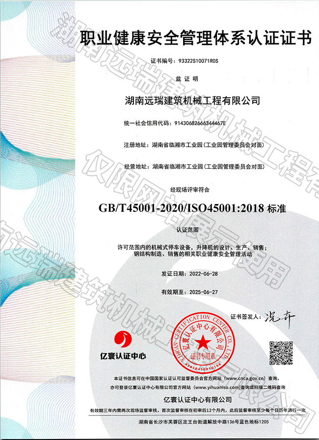 职业健康安全管理体系认证证书