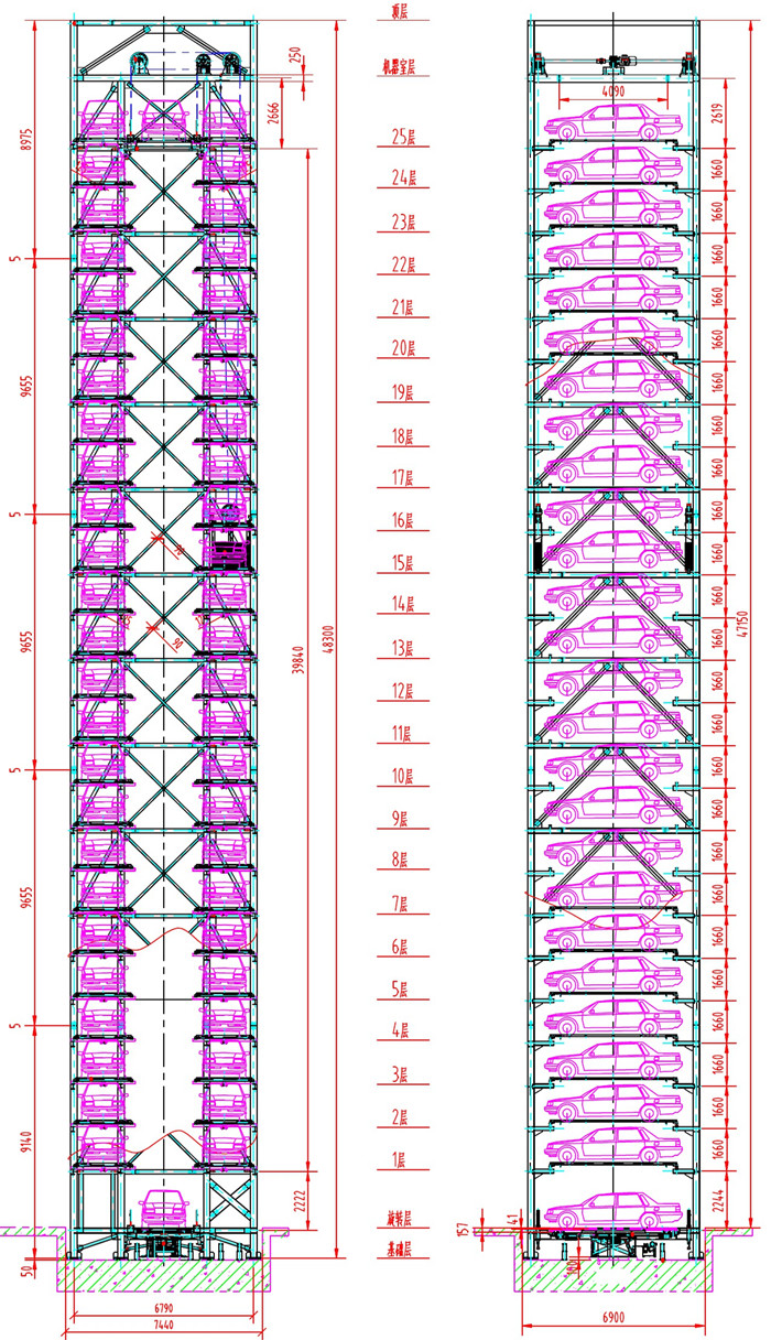 垂直升降类车库一般以二辆车为一个层面,整个存车库有20-25存车层,可停放40-50辆车,而点地面积不到50平方米,平均每辆占地面积只有1~1.2平方米,是在机械式车库类型中平面和空间利用率较高的。